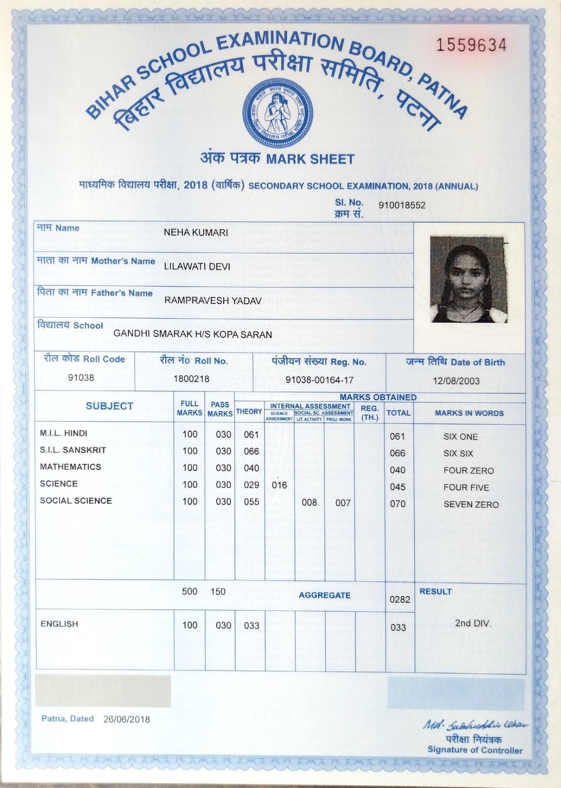 | Exam | Full Marks | Pass Marks | Marks Obtained |