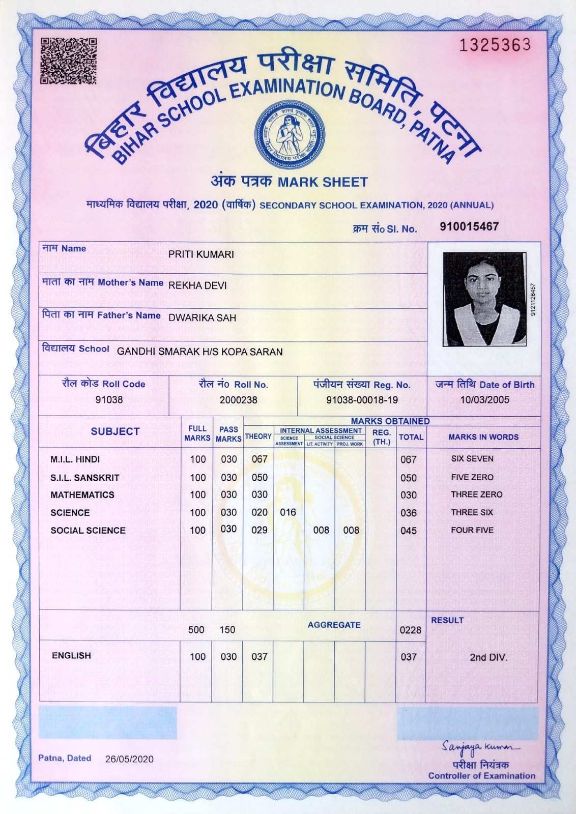 | Exam | Full Marks | Pass Marks | Marks Obtained |